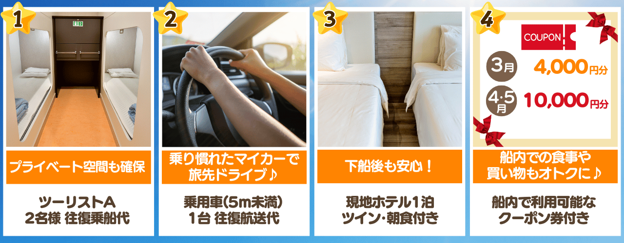 旅行代金には往復フェリーと現地ホテル1泊、オトクな船内クーポンがセット!あとは出発日を決めるだけ♪
