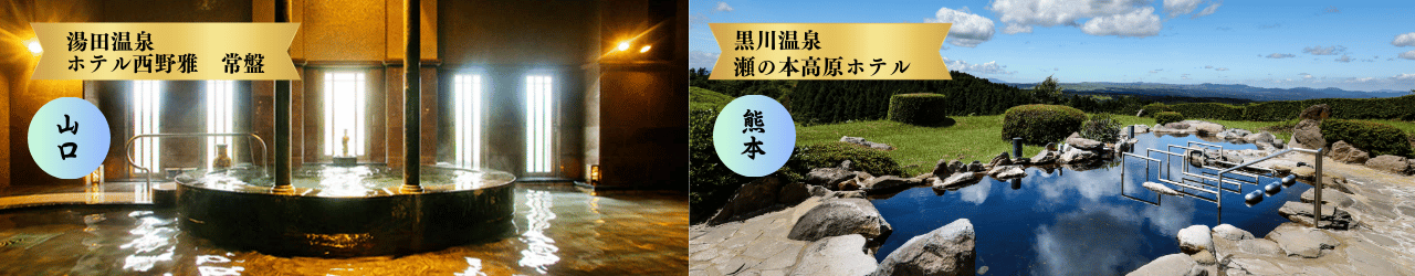 こちらのプランでは山口・湯田温泉「ホテル西の雅 常盤」または熊本・黒川温泉「瀬の本高原ホテル」をお選びいただけます。